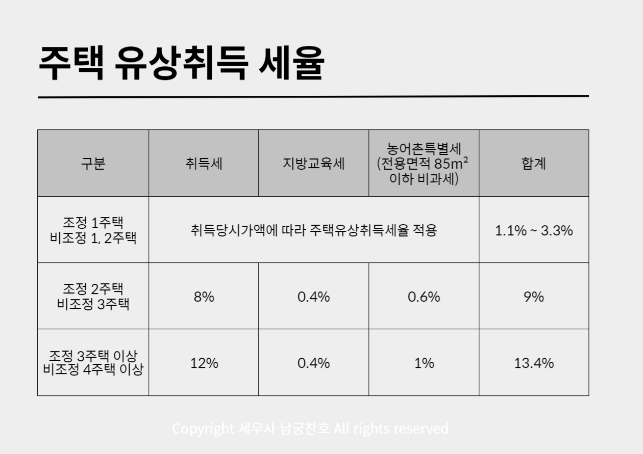두번째 주택을 조정대상지역에서 취득하는 경우 취득세 중과세율을 적용합니다. 이때 적용할 취득세율은 8%입니다. 여기에 지방교육세와 농어촌특별세를 추가하면 총 9% 세율을 적용합니다.