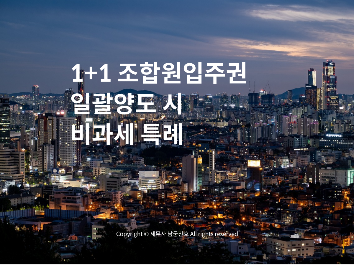 1+1 조합원입주권을 취득한 조합원이 그 입주권 2개를 일괄하여 양도하는 경우 그중 1개에 대해서 비과세 적용을 검토해 볼 수 있습니다.