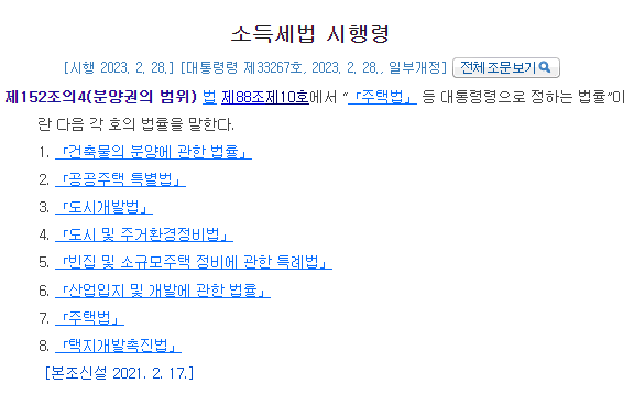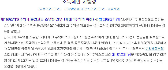 여기서 참고할 점은 입법실수로 1️⃣ A 주택(조문에서 "종전주택"을 말함)을 취득 후 1년을 경과하여 분양권을 취득할 것 요건이 2022년 2월 15일 포함되어 해당일 전 (2021년 1월 1일 ~ 2022년 2월 14일)에 취득한 분양권은 1️⃣ 요건을 적용하지 않습니다. (소득세법 시행령 부칙 대통령령 제32420호)