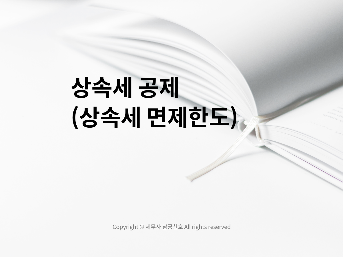| 기타인적공제 | ① 자녀 공제 : 피상속인의 자녀로서 인당 5천만원 ② 연로자 공제 : 상속인 및 동거가족 중 65세 이상인 자(배우자 제외)로서 인당 5천만원 ③ 미성년자 공제 : 상속인 및 동거가족 중 미성년자(배우자 제외)로서 1천만원*19세에 달하기 까지 연수 ④ 장애인 공제 : 상속인 및 동거가족 중 장애인으로서 인당 1천만원*기대여명연수 |