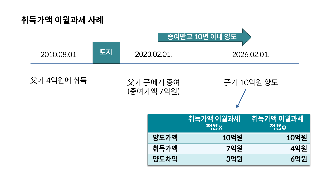 아버지가 4억원에 취득한 토지를 아들에게 증여하고, 아들이 증여받고 10년이내 양도하는 경우 취득가액 이월과세 규정을 적용합니다.