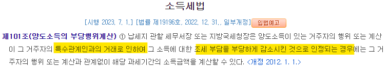 소득세법은 ✅ 특수관계인 간 거래로 인하여 ✅ 조세 부담을 부당하게 감소시킨 경우 납세자의 신고와 무관하게 과세관청이 양도세를 다시 계산할 수 있도록 하고 있습니다.