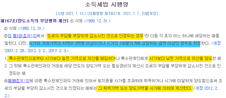 또한 조세부담을 부당하게 감소시킨 거래란 소득세법 시행령에서 정하고 있습니다.